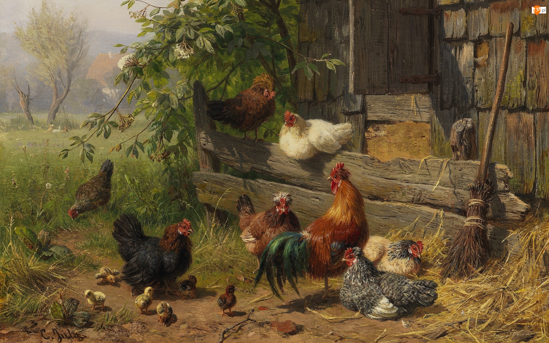 Carl Jutz, Kury, Kogut, Ptactwo, Obraz, Malarstwo, Zagroda, Wiejska, Domowe, Kurczaki