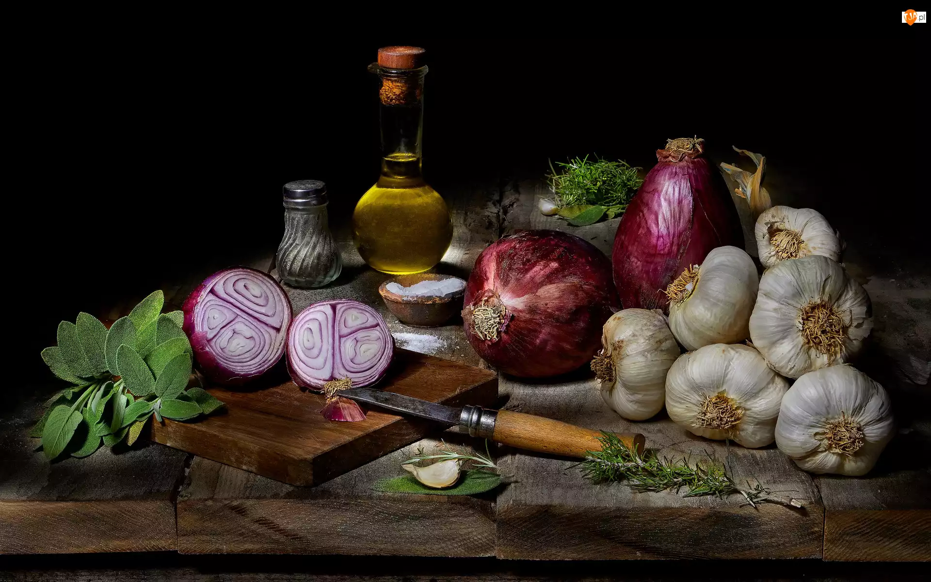 Kompozycja, Zioła, Deska, Sól, Cebula, Warzywa, Olej, Czosnek, Pieprz, Nóż