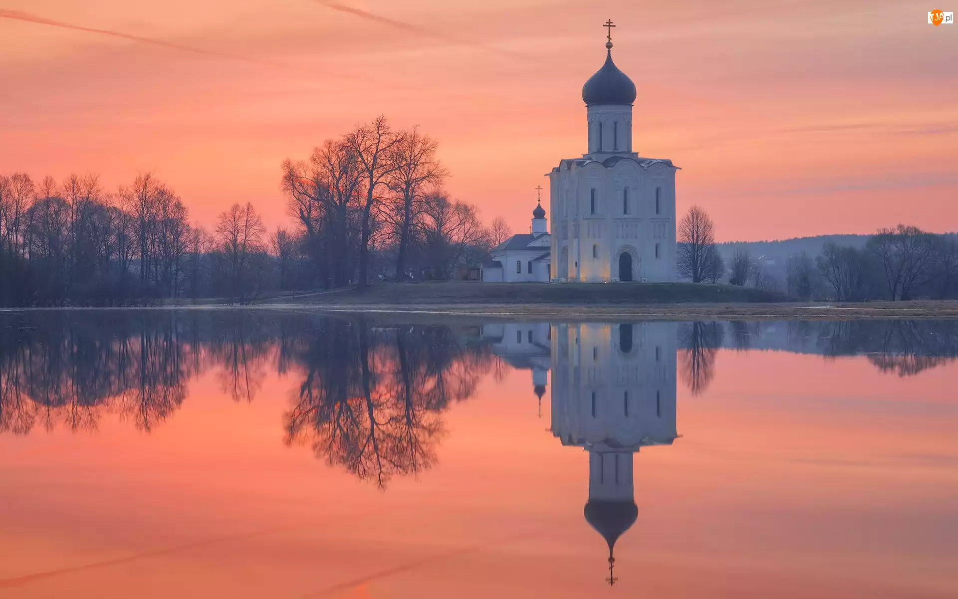 Jesień, Drzewa, Rzeka, Cerkiew, Odbicie