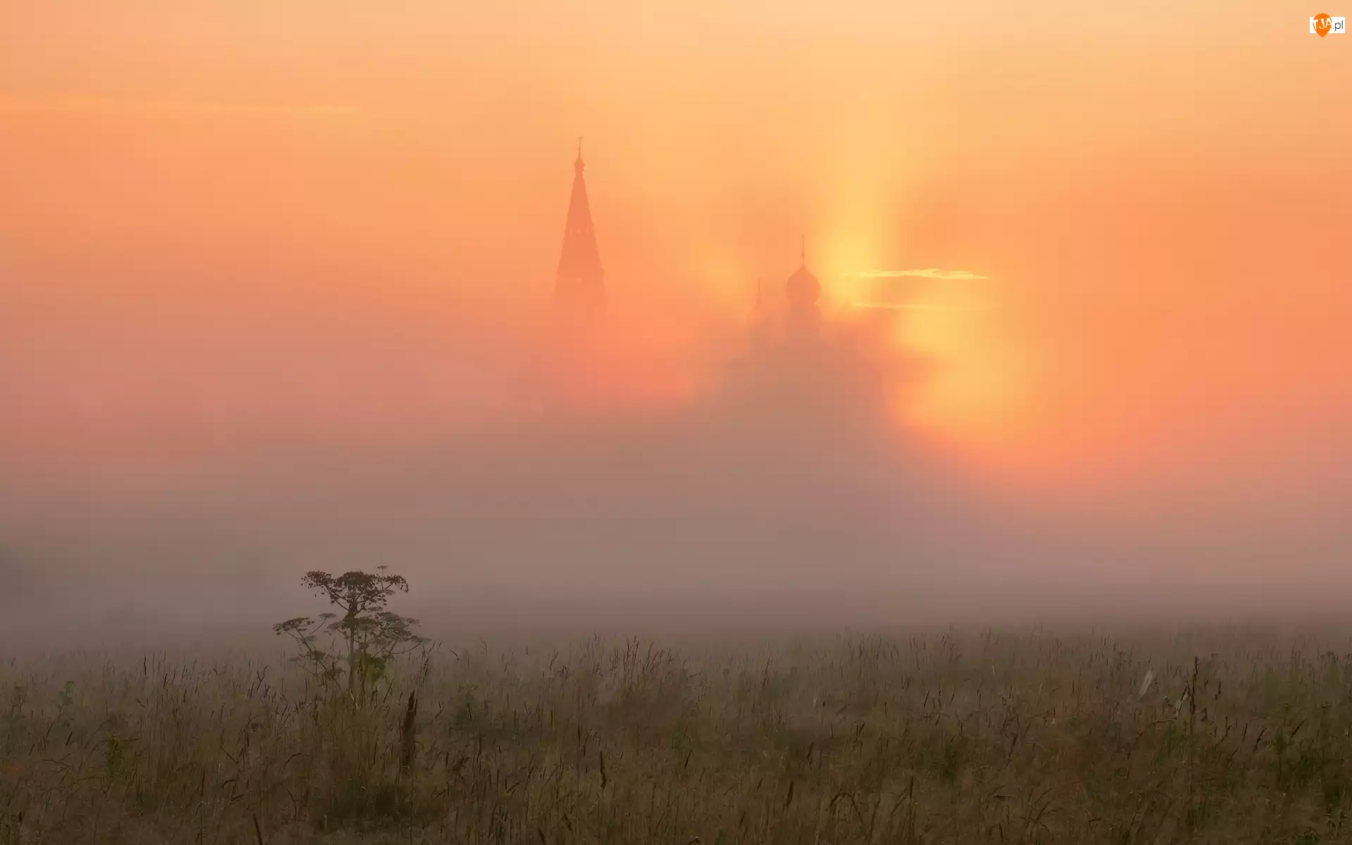 Cerkiew, Rosja, Wschód słońca, Łąka, Obwód jarosławski, Mgła, Roślina, Osenevo