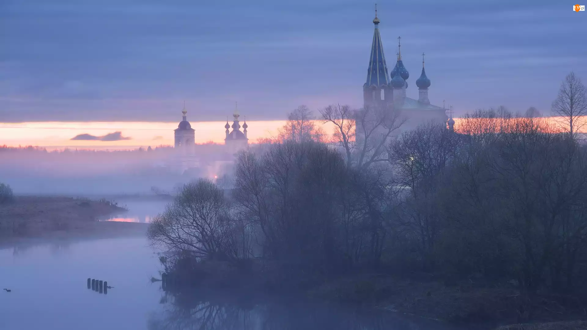 Drzewa, Dunilovo, Mgła, Obwód iwanowski, Rzeka Teza, Świt, Rosja, Cerkiew