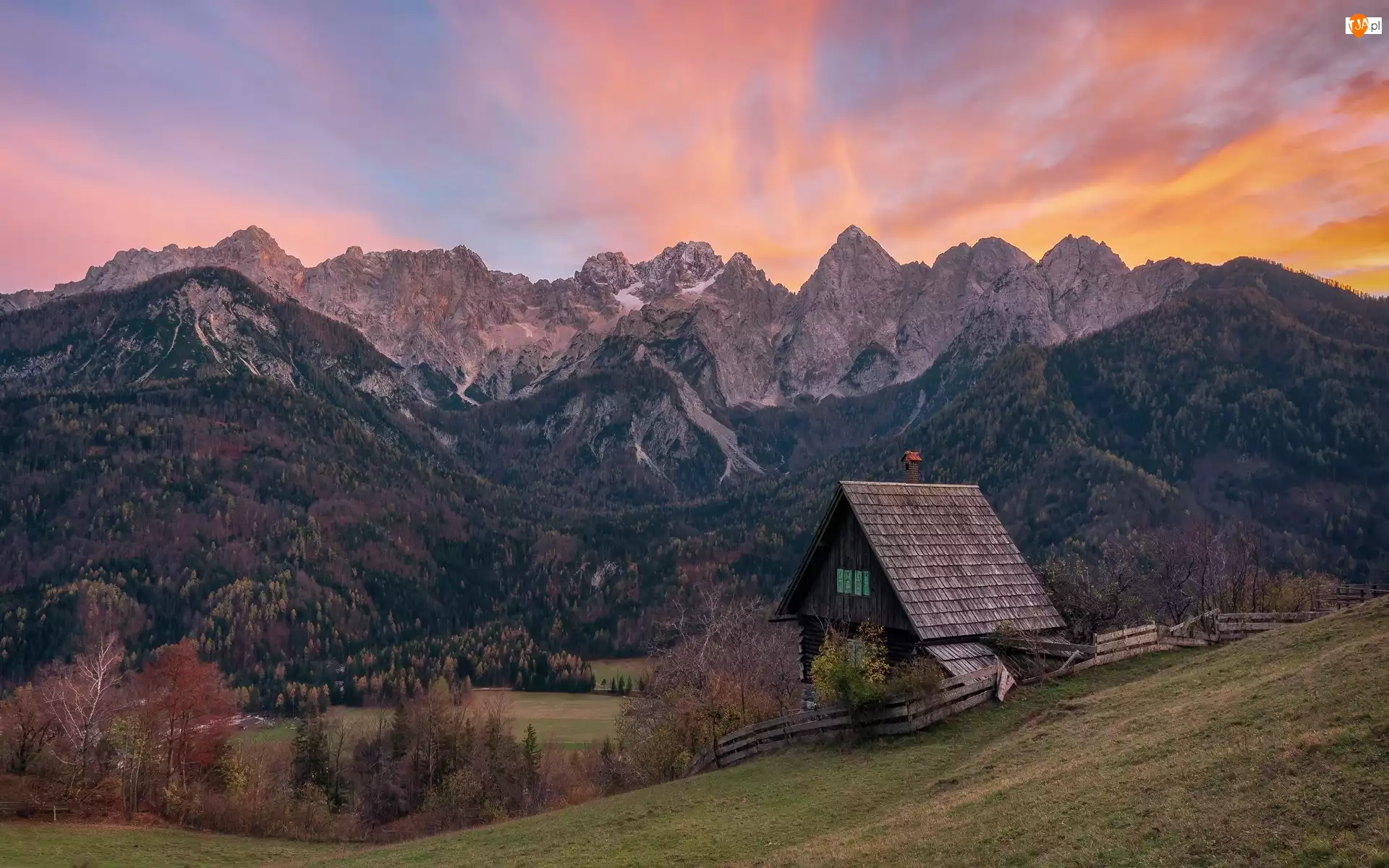 Alpy Julijskie, Las, Słowenia, Góry, Kranjska Gora, Dom, Drzewa