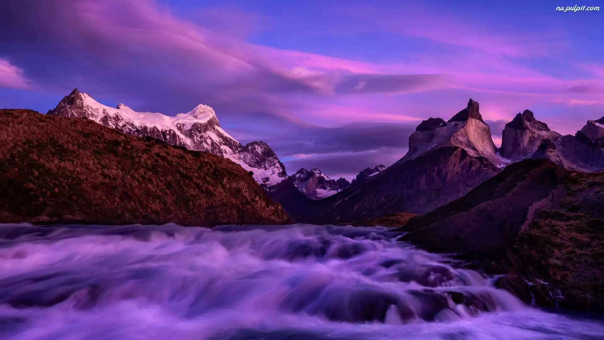Chile, Niebo, Park Narodowy Torres del Paine, Kolorowe, Cordillera del Paine, Góry, Torres del Paine, Masyw, Rzeka, Patagonia