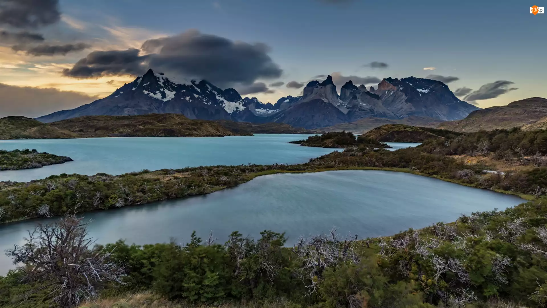 Chile, Ośnieżone, Patagonia, Krzewy, Park Narodowy Torres del Paine, Szczyty, Jezioro, Góry Torres del Paine, Chmury