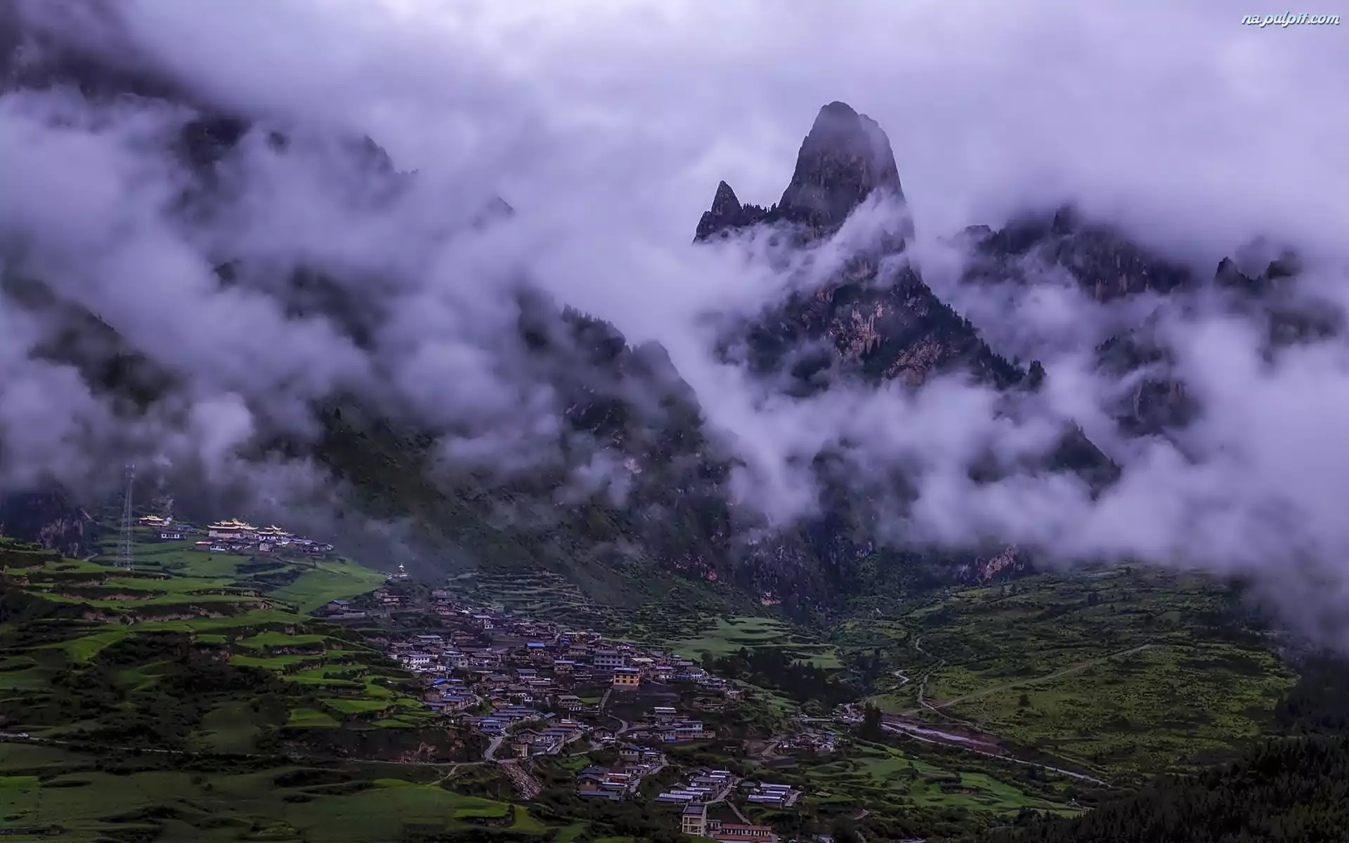 Chiny, Góry, Miasteczko, Chmury, Tybet