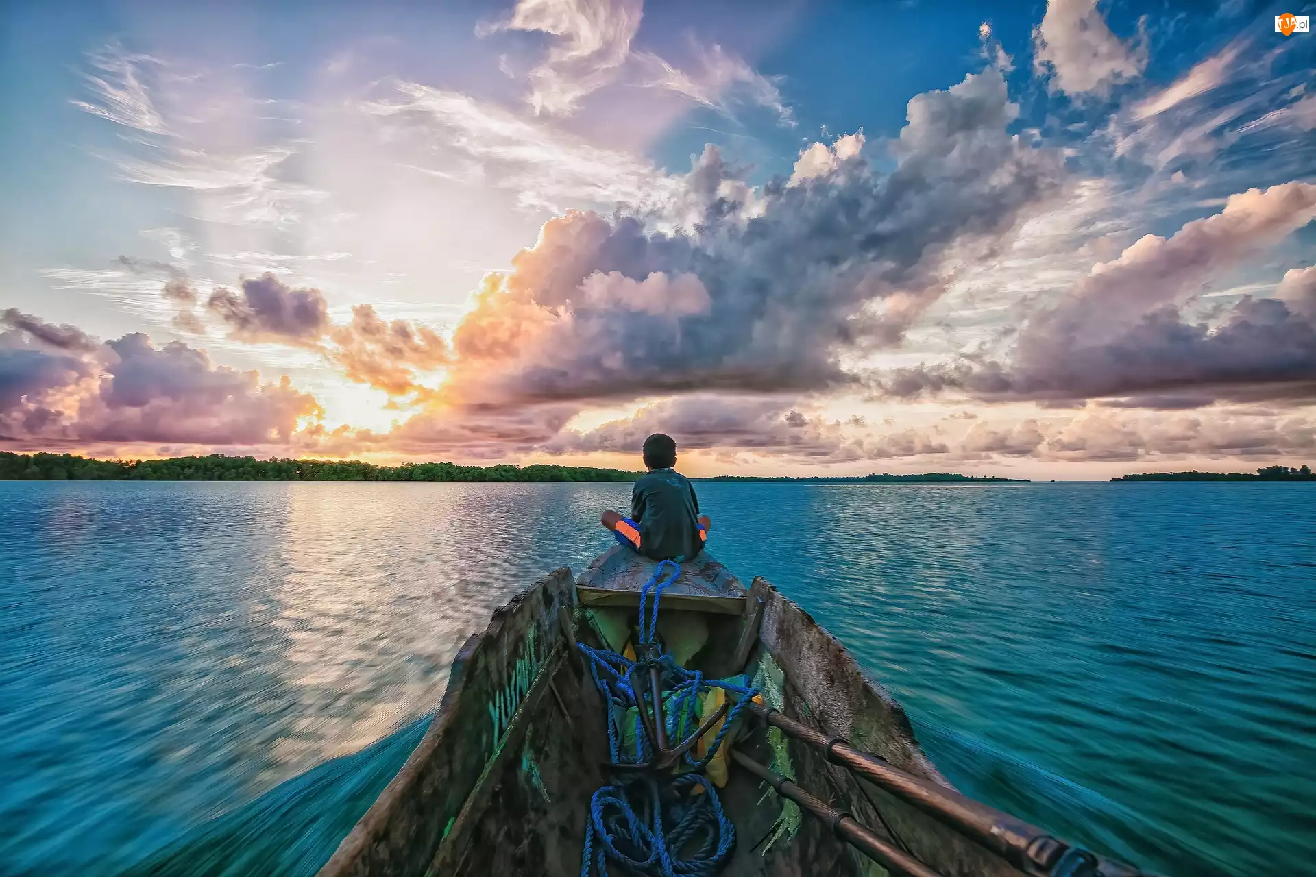 Morze, Laguna, Chłopiec, Chmury, Łódka, Niebo