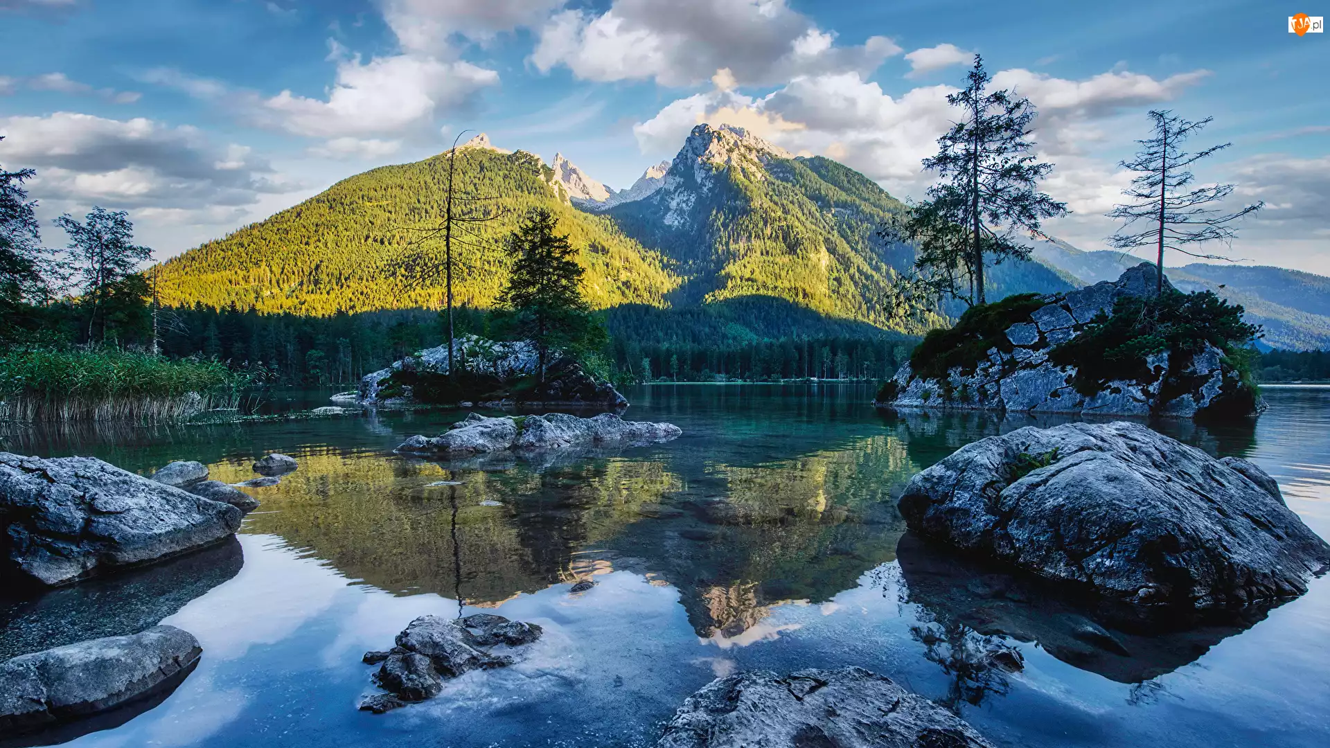 Chmury, Bawaria, Las, Skały, Drzewa, Góry, Alpy, Niemcy, Jezioro Hintersee