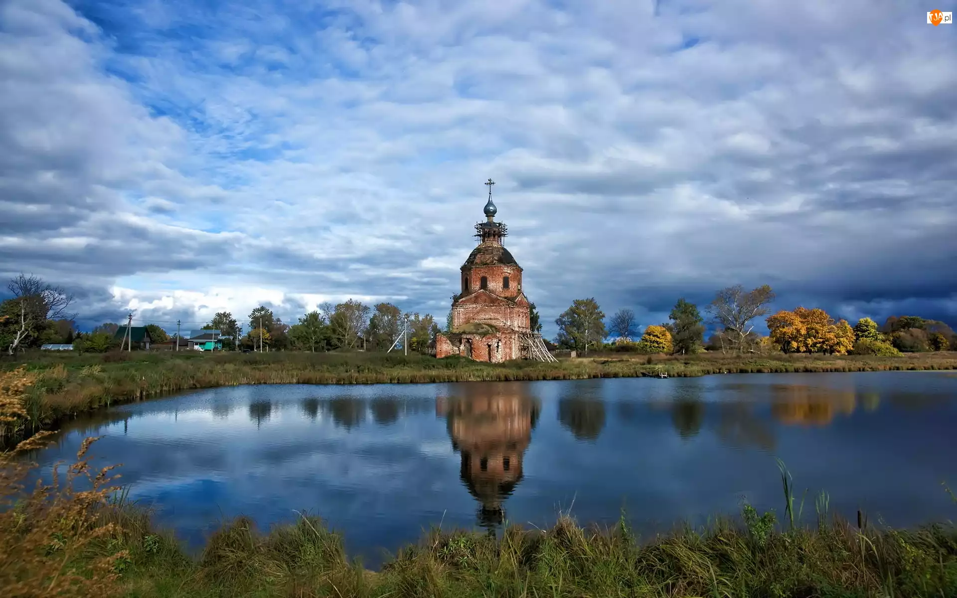 Chmury, Cerkiew, Jezioro, Ruiny, Drzewa