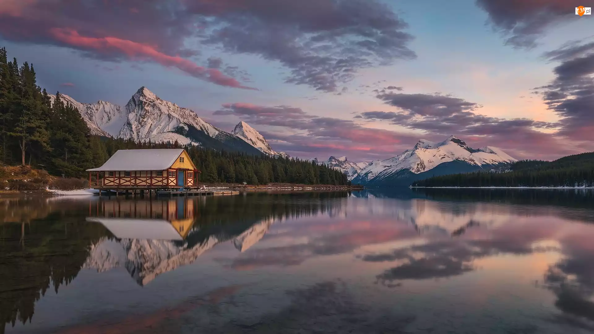 Chmury, Drzewa, Lasy, Góry, Park Narodowy Jasper, Kanada, Jezioro, Prowincja Alberta, Maligne Lake, Przystań