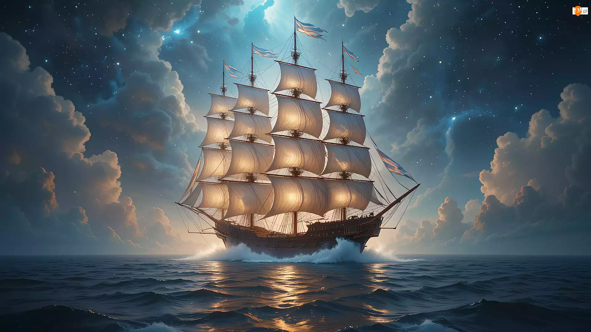 Chmury, Grafika, Żaglowiec, Morze, Gwiazdy