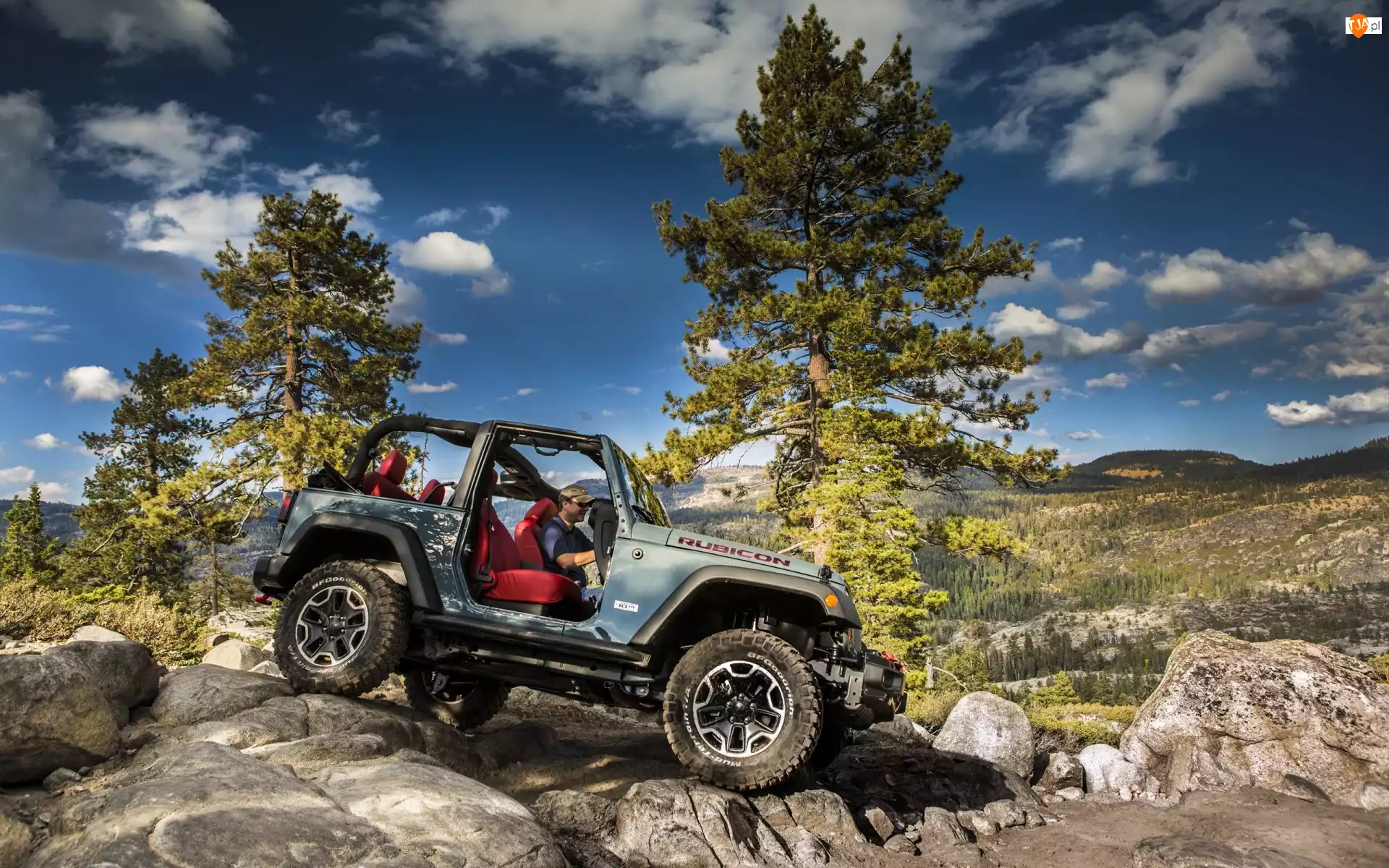 Chmury, Jeep, Drzewa, Wrangler, Kamienie