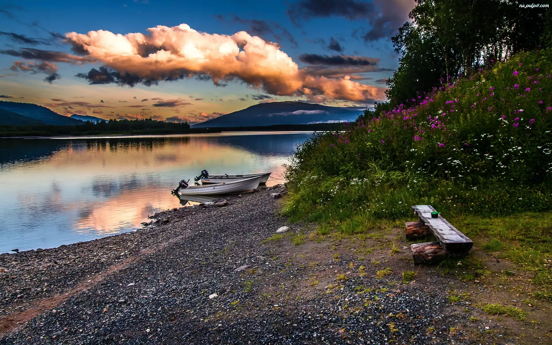 Chmury, Jezioro, Góry, Łodzie, Kwiaty