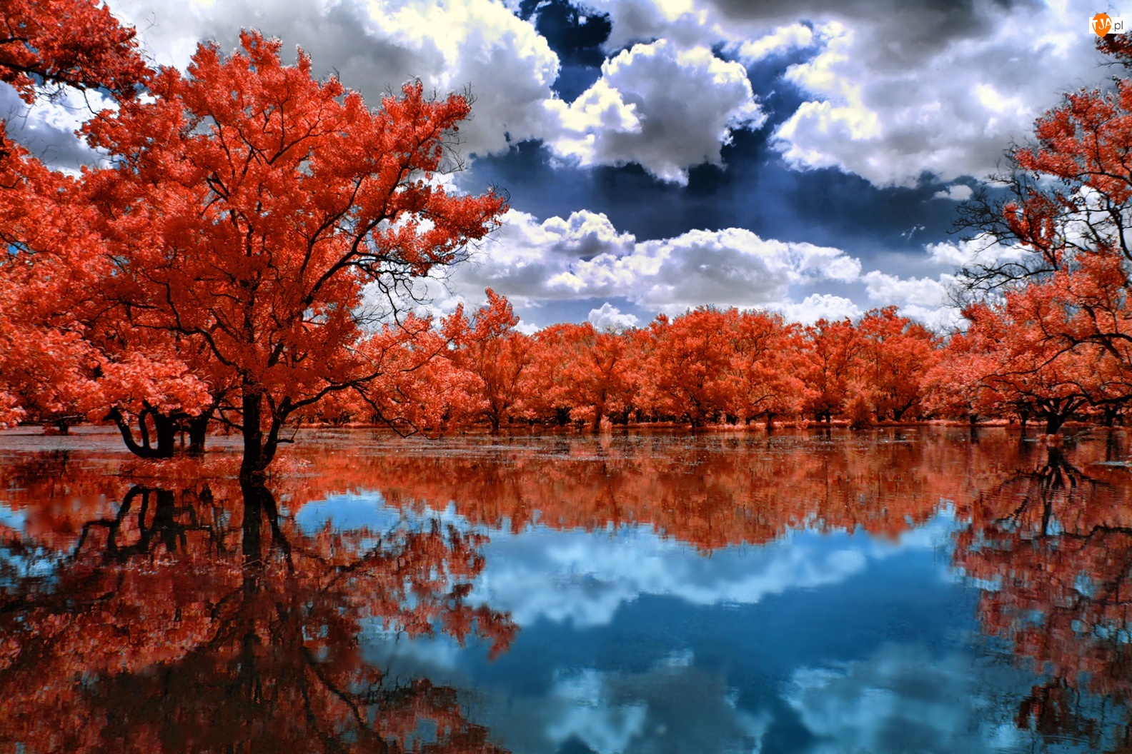 Chmury, Jezioro, Pomarańczowe, Drzewa