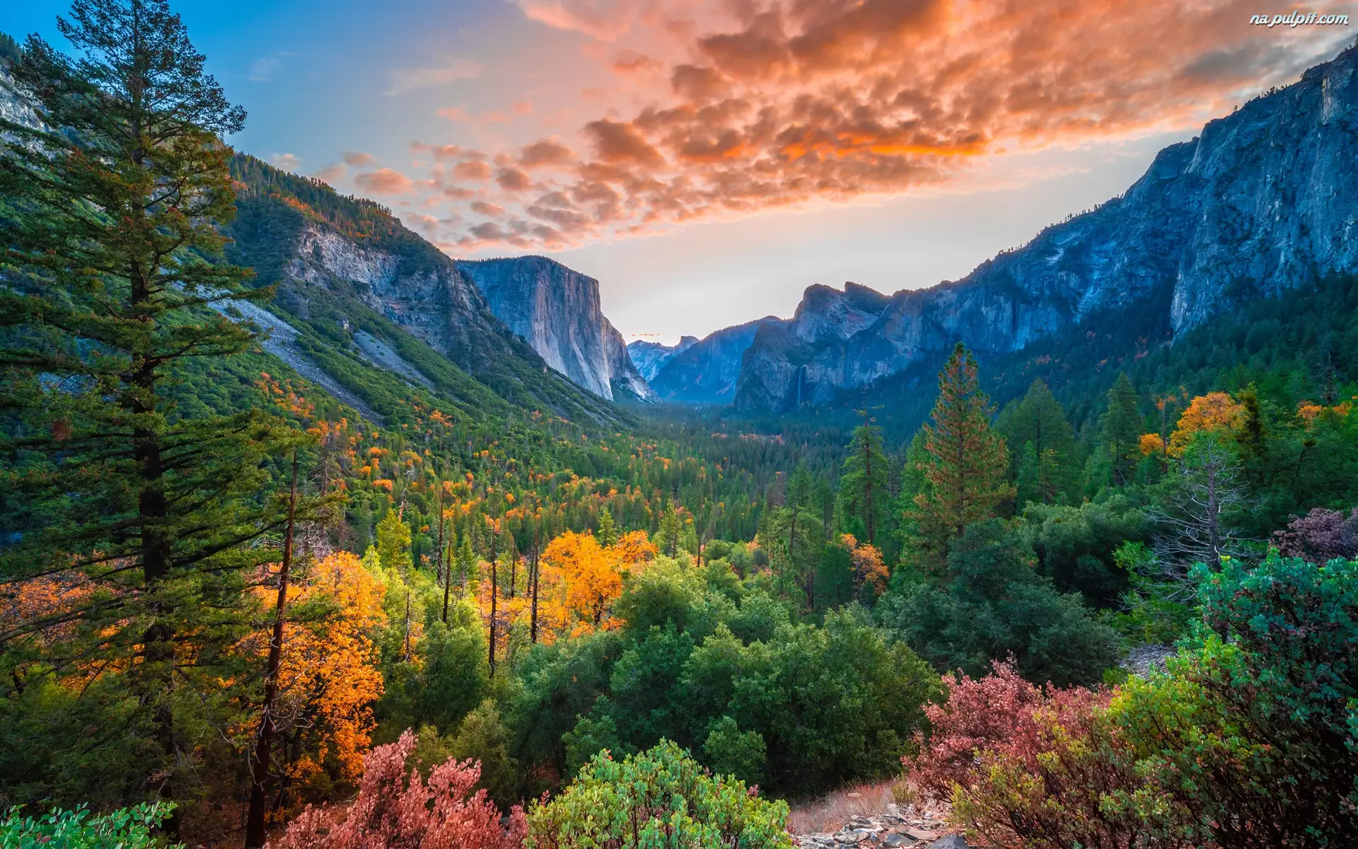 Chmury, Kalifornia, Drzewa, Dolina, Jesień, Park Narodowy Yosemite, Góry, Stany Zjednoczone, Yosemite Valley