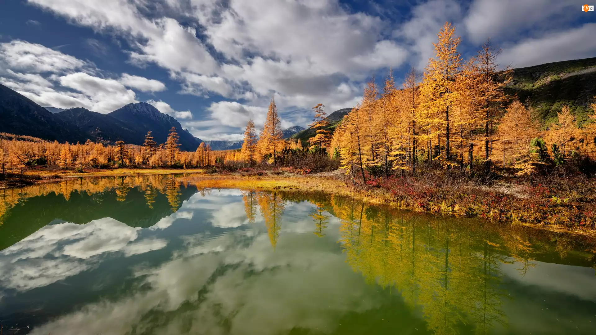 Chmury, Kołyma, Odbicie, Drzewa, Góry, Jezioro, Jacka Londona, Rosja, Jesień