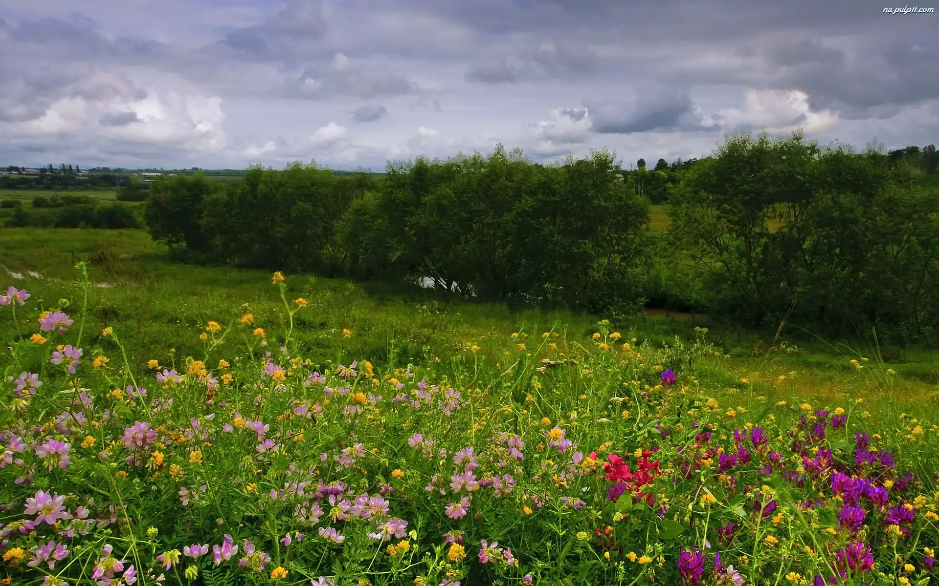 Chmury, Łąka, Drzewa, Kwiaty, Rzeka