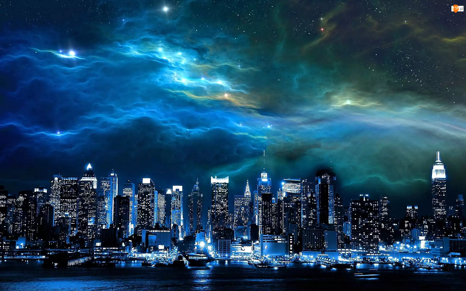 Chmury, Miasto, Drapacze Chmur, Nocą, Niebo