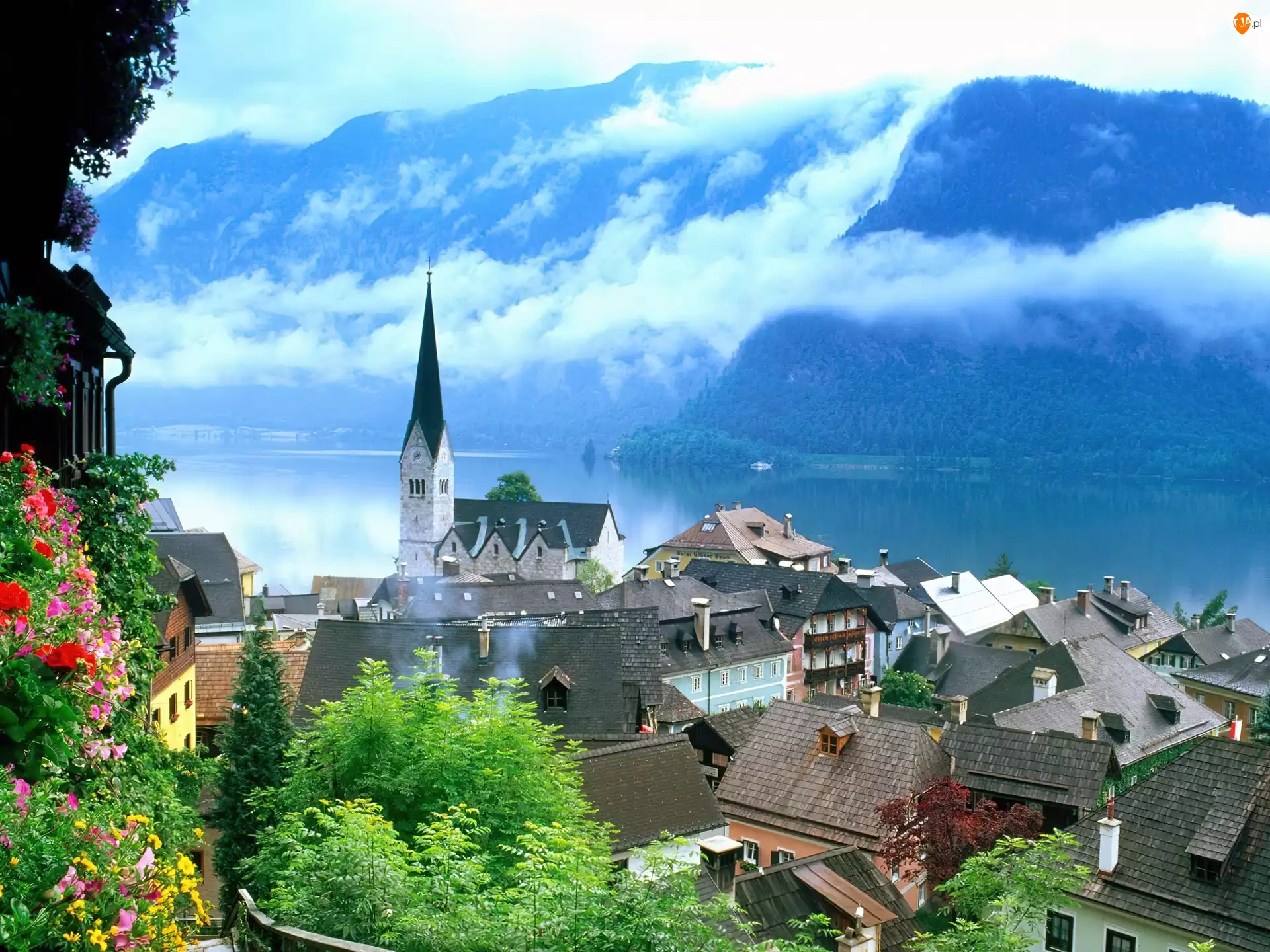 Jeziorem, Chmury, Nad, Miasto, Góry