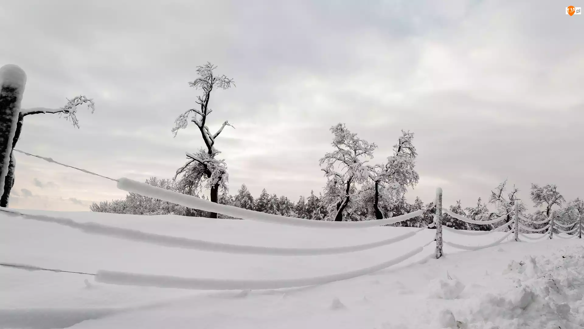 Chmury, Zima, Drzewa, Ogrodzenie