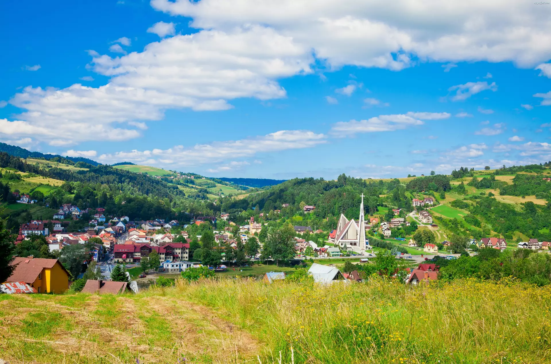 Chmury, Nad Dunajcem, Domy, Polska, Drzewa, Krościenko