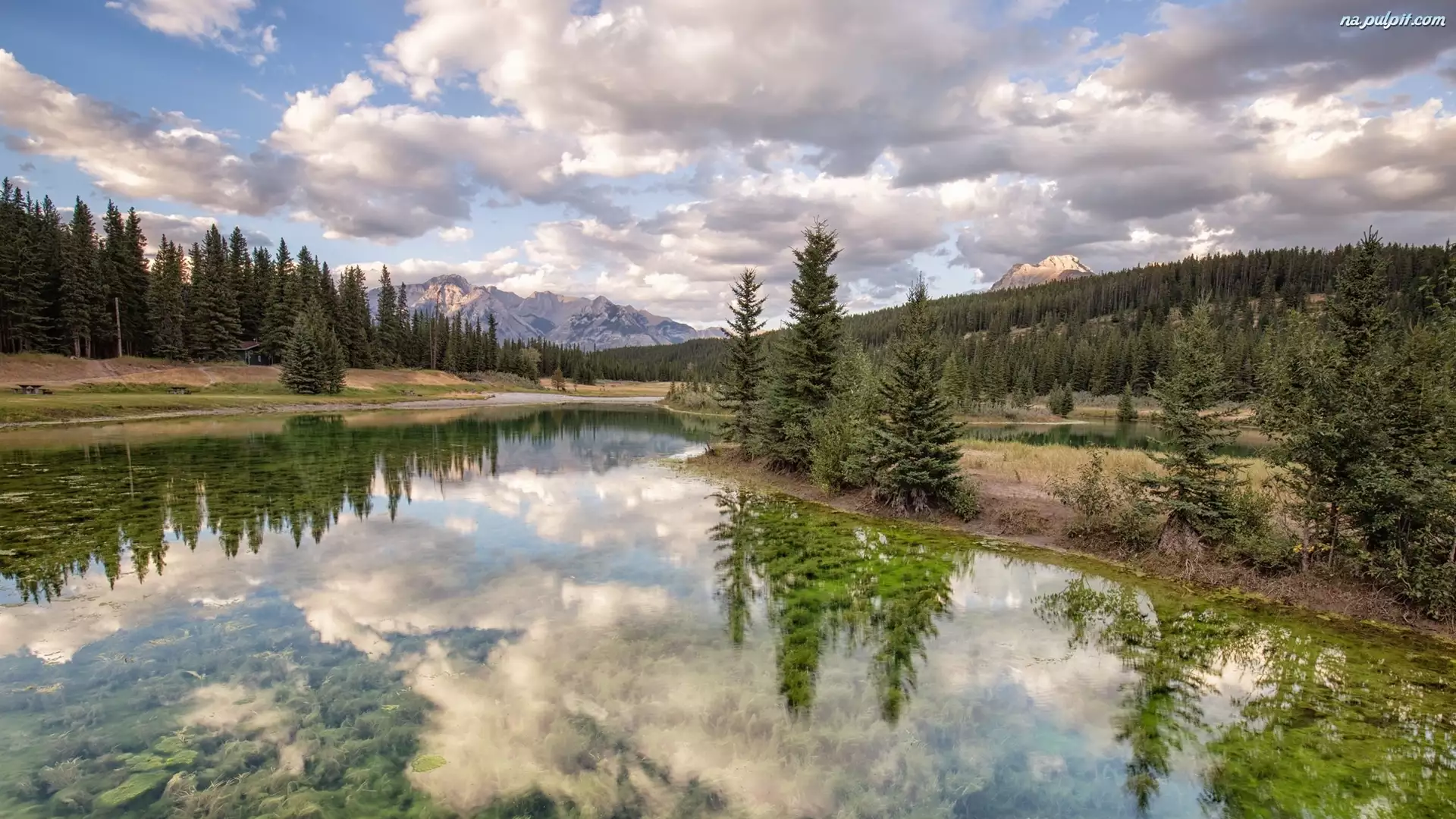 Drzewa, Odbicie, Rzeka, Góry, Chmury