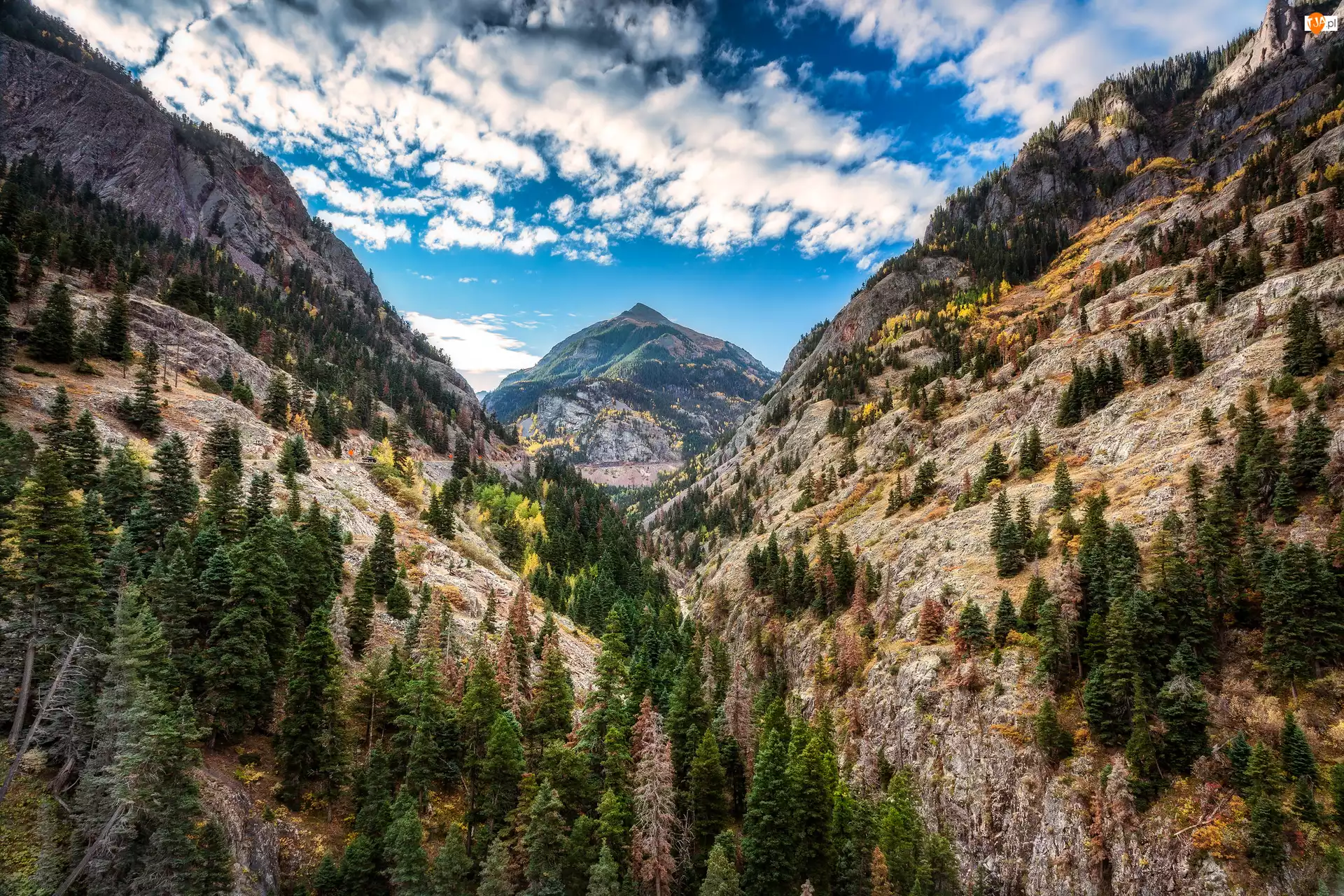 Szczyt Uncompahgre Peak, Góry San Juan Mountains, Chmury, Stany Zjednoczone, Drzewa, Stan Kolorado