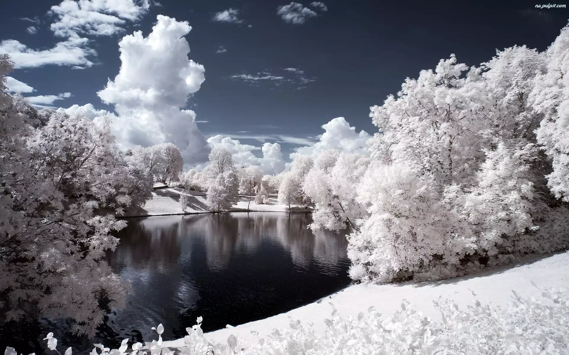 Chmury, Ośnieżone, Staw, Drzewa, Park