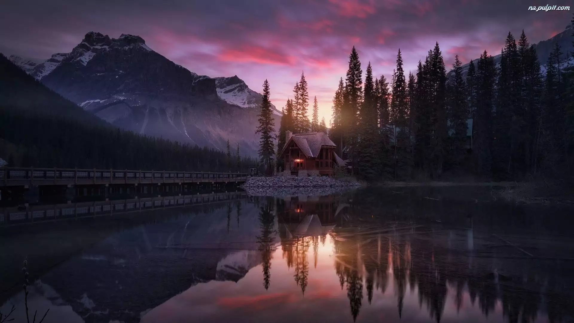 Chmury, Oświetlony, Drzewa, Kanada, Zachód słońca, Park Narodowy Yoho, Most, Góry, Dom, Jezioro, Emerald Lake, Prowincja Kolumbia Brytyjska
