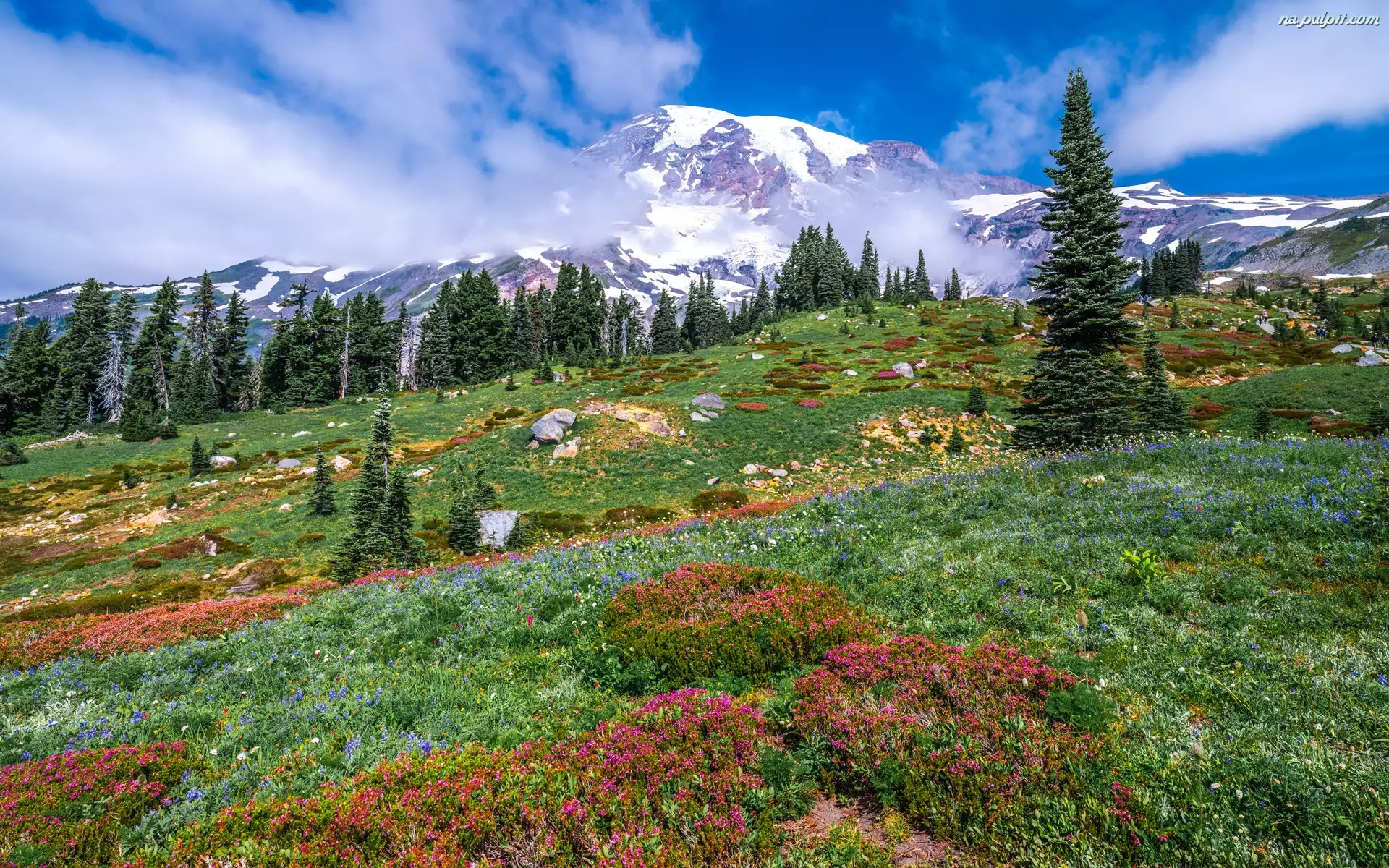 Chmury, Park Narodowy Mount Rainier, Drzewa, Stan Waszyngton, Góry, Łąka, Stany Zjednoczone, Stratowulkan Mount Rainier
