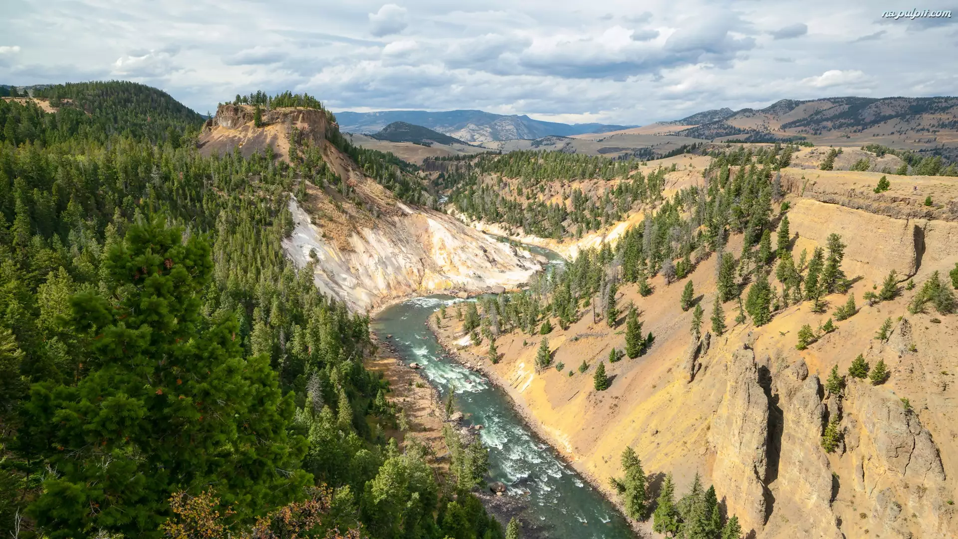 Chmury, Park Narodowy Yellowstone, Las, Stan Wyoming, Rzeka Yellowstone, Góry, Stany Zjednoczone, Drzewa