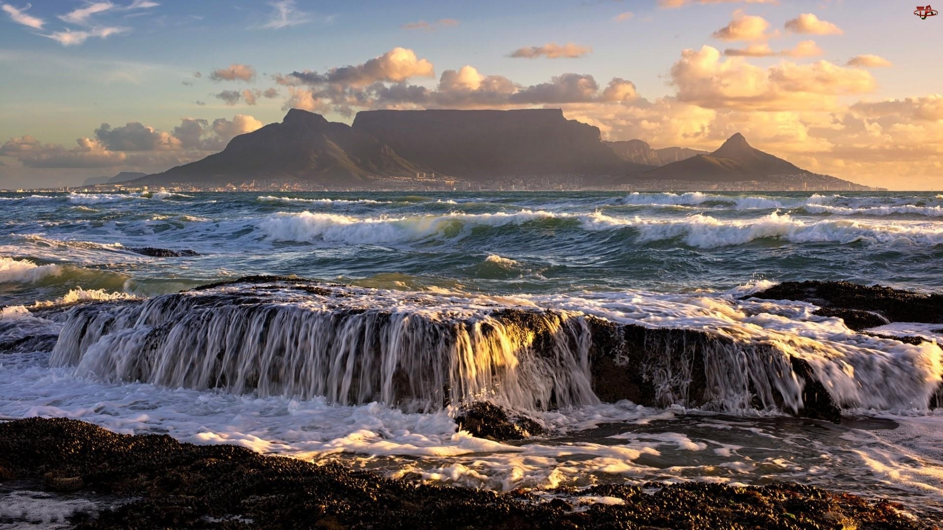 Wodospad, Chmury, Fale, Rzeka, Góry