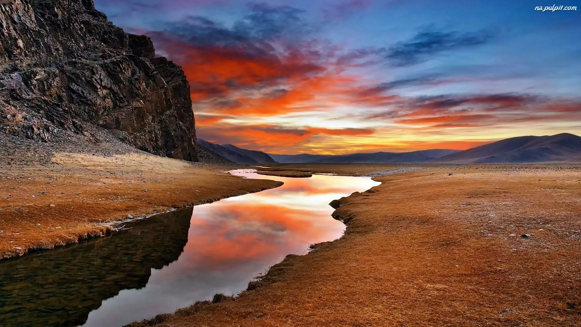 Chmury, Rzeka, Zachód, Step, Słońca, Góry