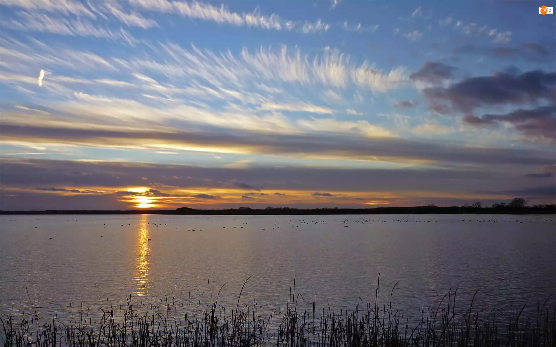 Chmury, Rzeka, Zachód, Trawy, Słońca