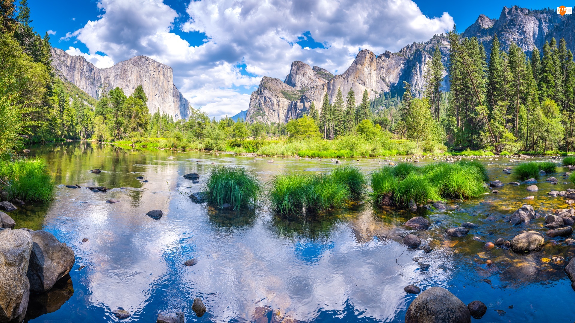 Chmury, Stan Kalifornia, Góry Sierra Nevada, Rzeka Merced, Drzewa, Park Narodowy Yosemite, Zielona, Stany Zjednoczone, Trawa
