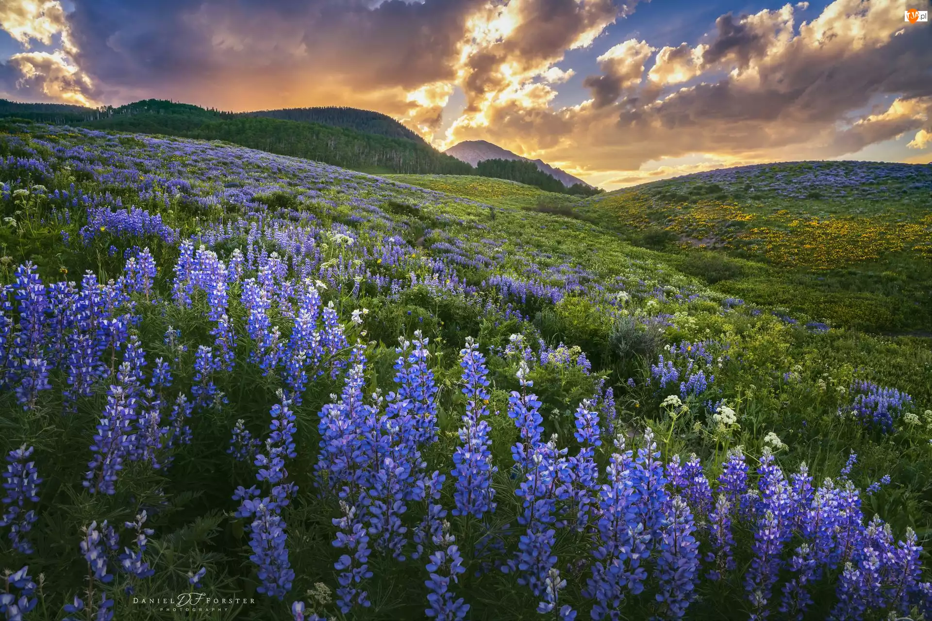 Chmury, Stan Kolorado, Zachód słońca, Niebieskie, Łubiny, Góry, Elk Mountains, Stany Zjednoczone, Łąka