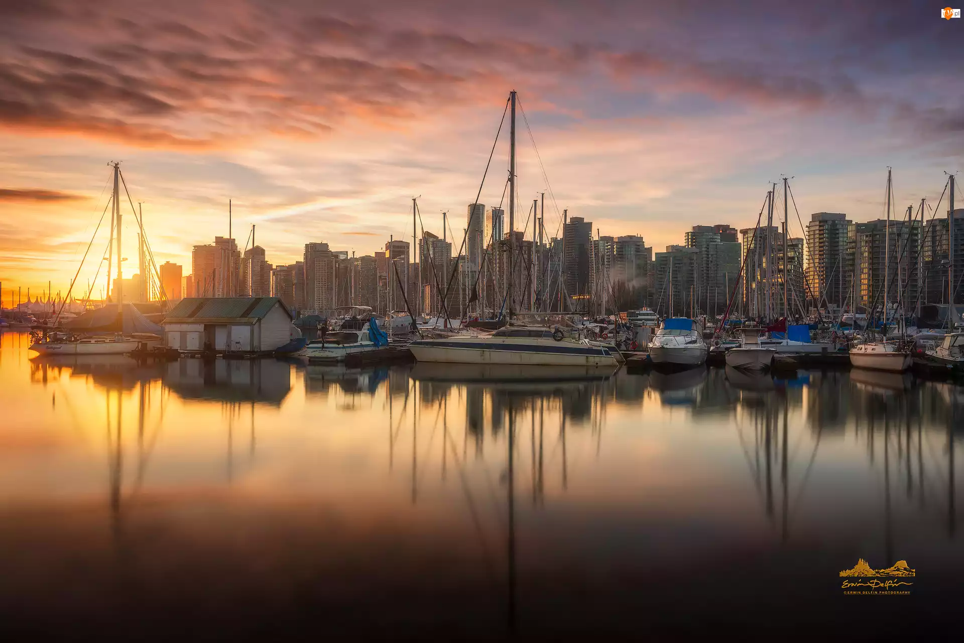 Chmury, Vancouver, Wschód słońca, Żaglówki, Wieżowce, Prowincja Kolumbia Brytyjska, Stanley Park Marina, Kanada, Przystań