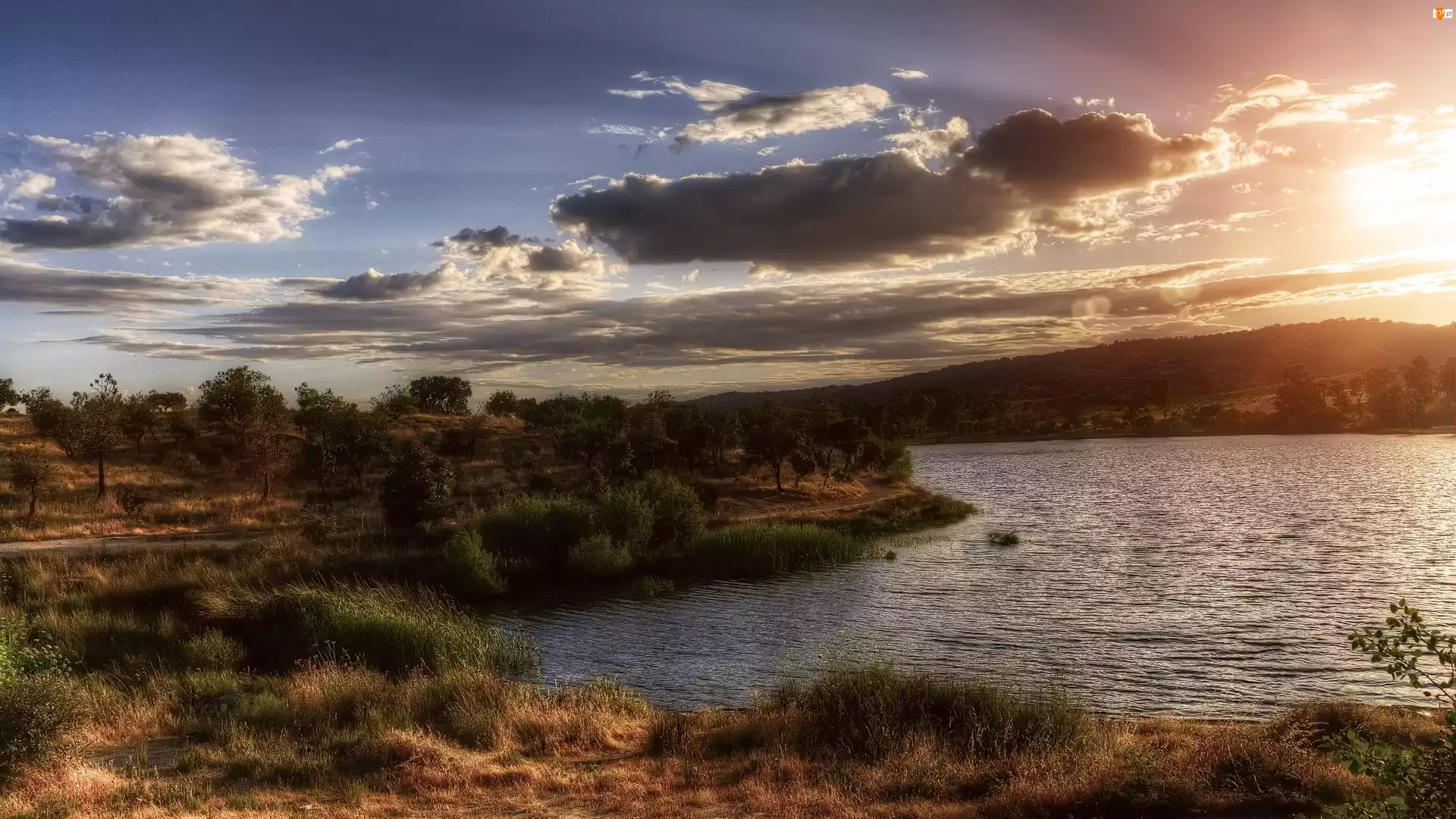 Chmury, Zachód, Jezioro, Słońca, Drzewa