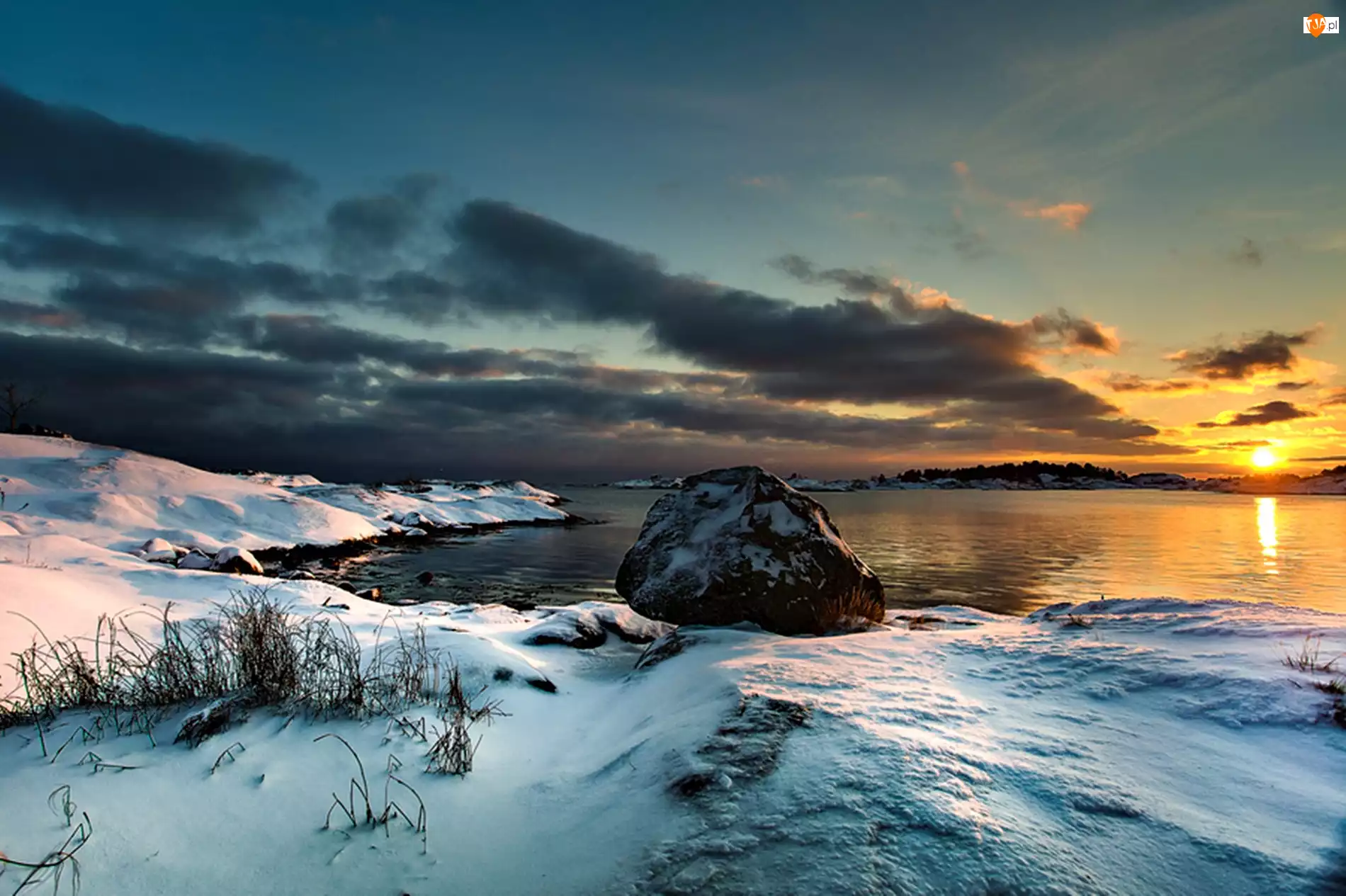 Chmury, Zachód, Morze, Słońca, Śnieg