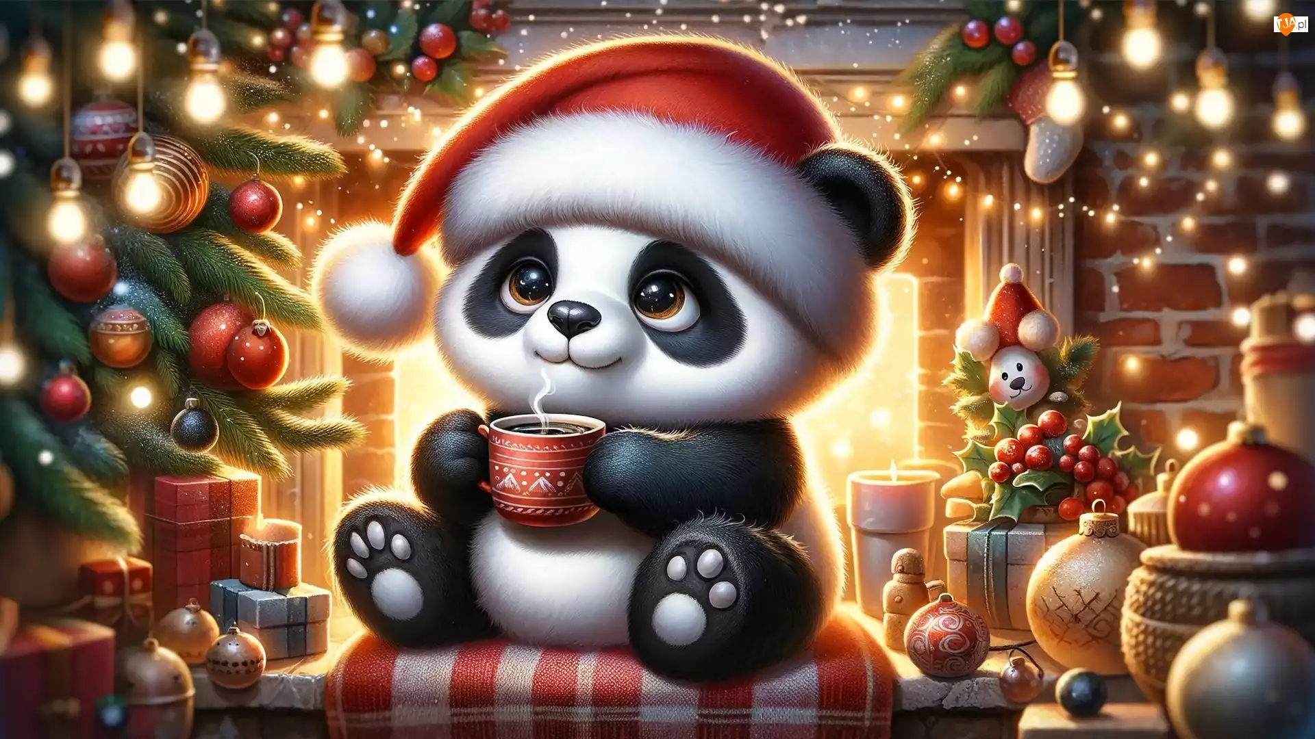 Choinka, Boże Narodzenie, Czapka, Prezenty, Panda, Mikołaja, Bombki, Kubek