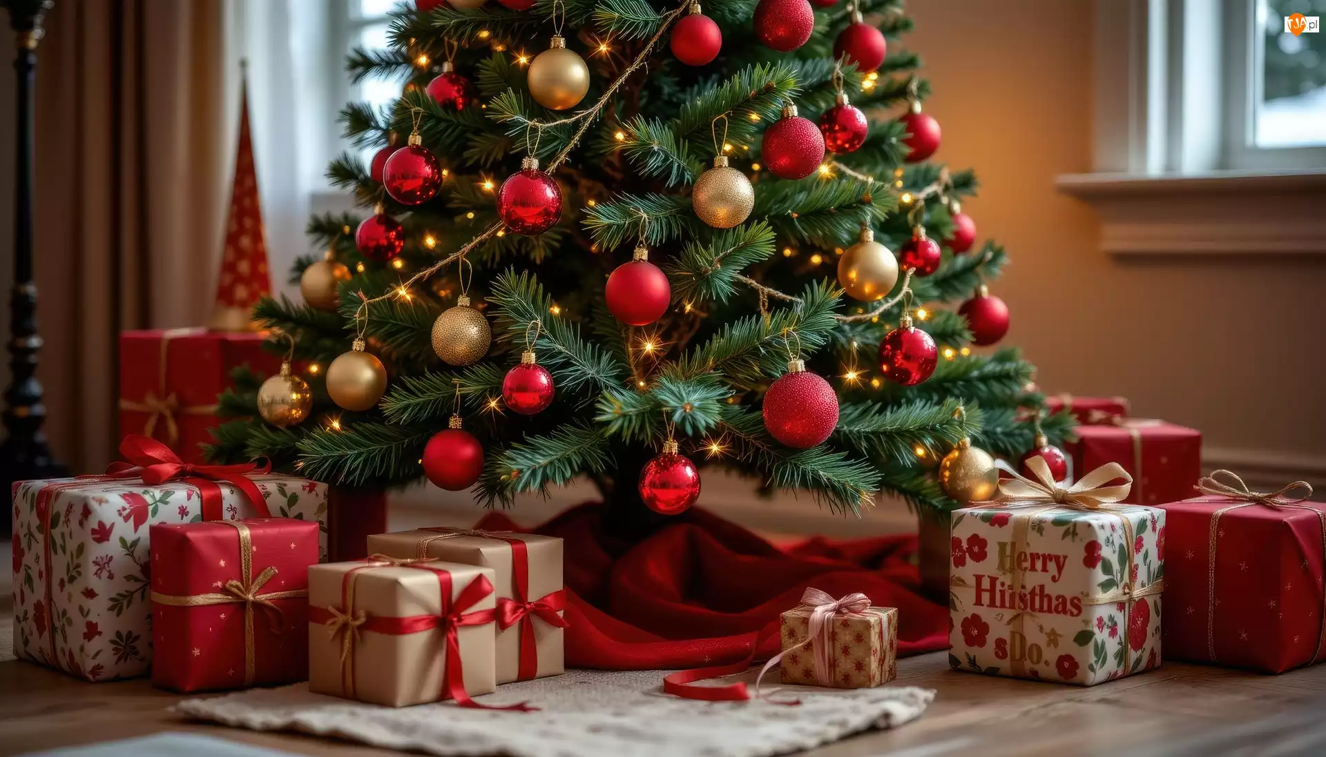 Choinka, Boże Narodzenie, Czerwone, Prezenty, Złote, Bombki