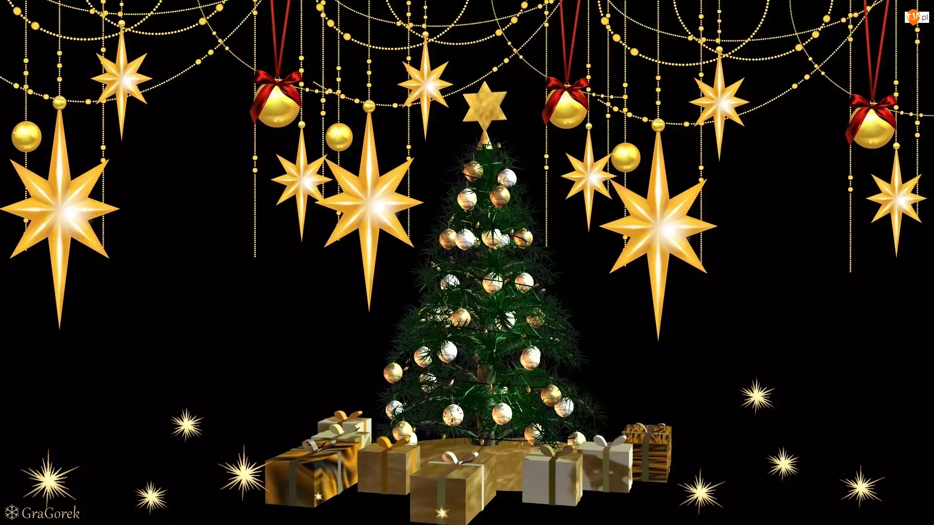 Czarne, Boże Narodzenie, Choinka, Tło, Gwiazdy, Prezenty, Grafika, Bombki