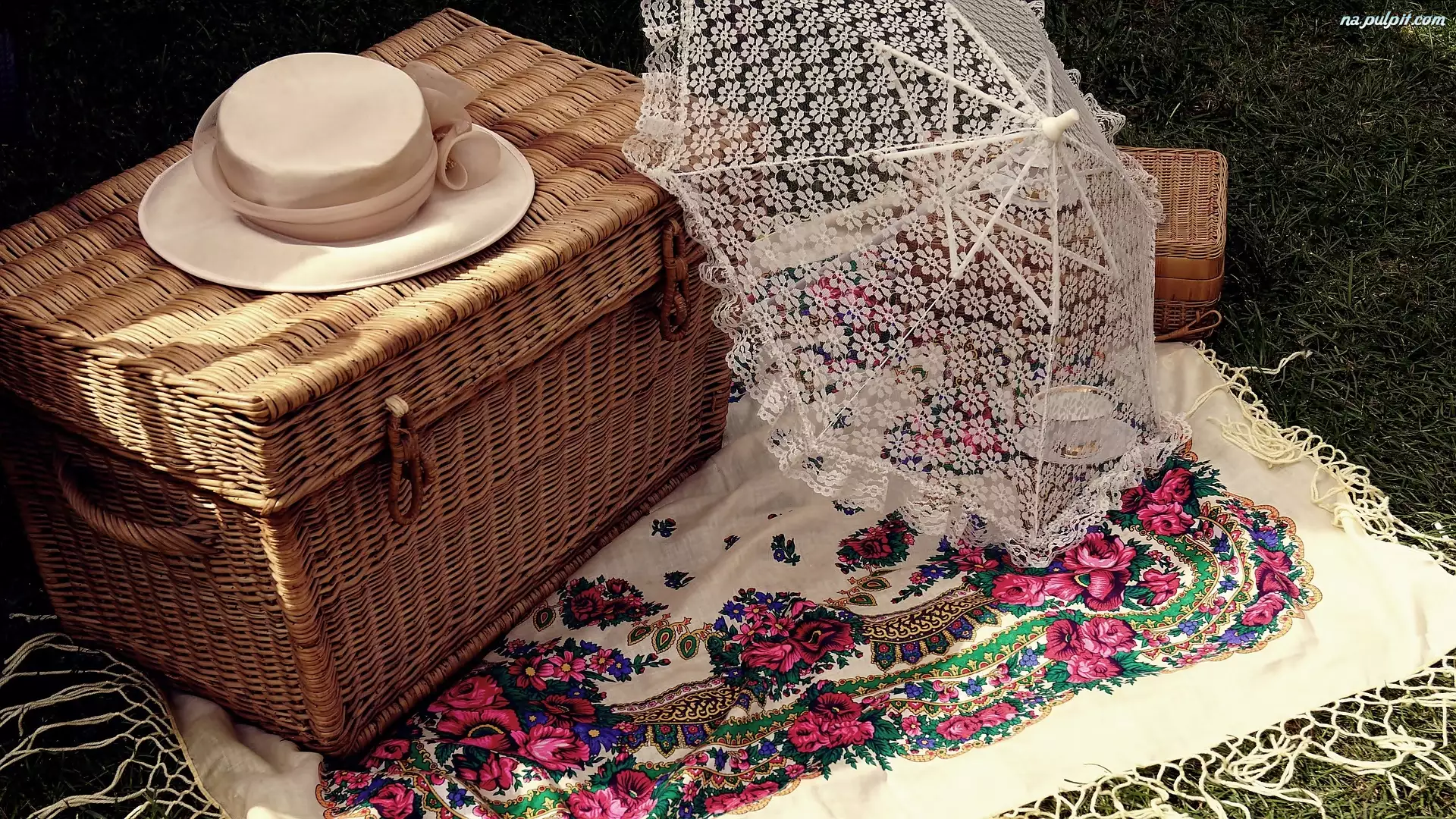 Chusta, Parasolka, Skrzynia, Trawnik, Wiklinowy, Kapelusz, Kompozycja, Kosz