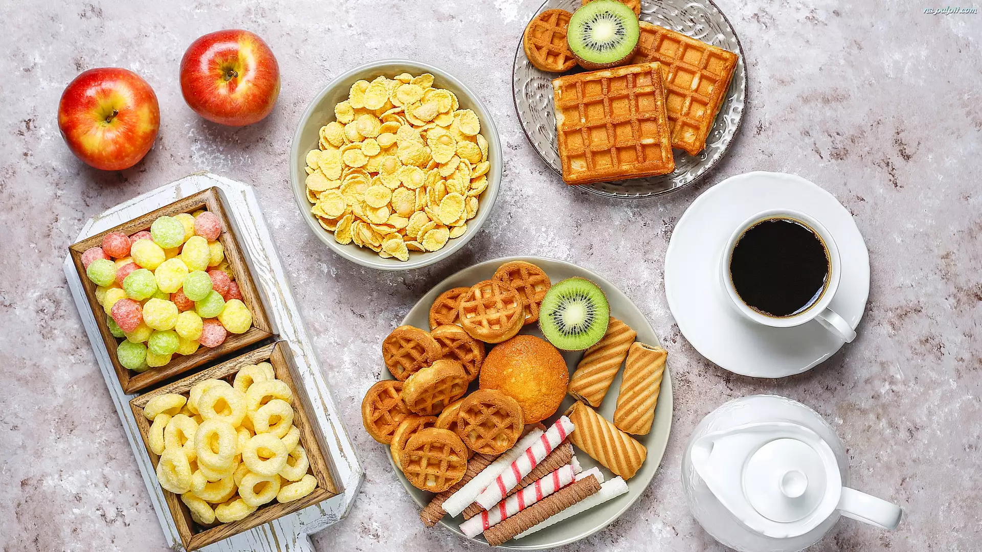 Kiwi, Filiżanka, Jabłka, Chrupki, Płatki, Dzbanek, Gofry, Kawa, Ciastka