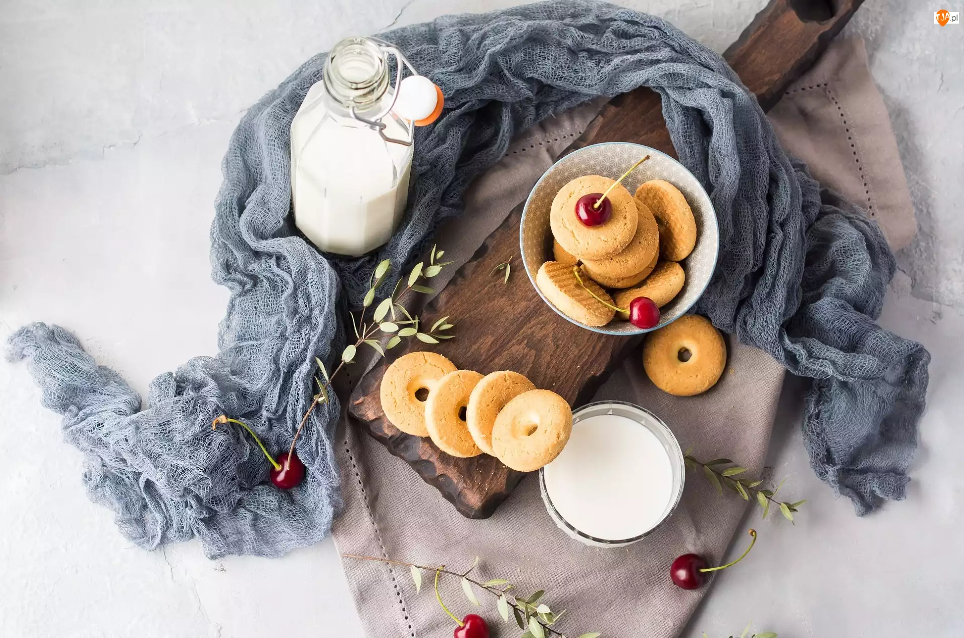 Gałązki, Szklanka, Obrus, Czereśnie, Szal, Mleko, Miseczka, Butelka, Ciasteczka