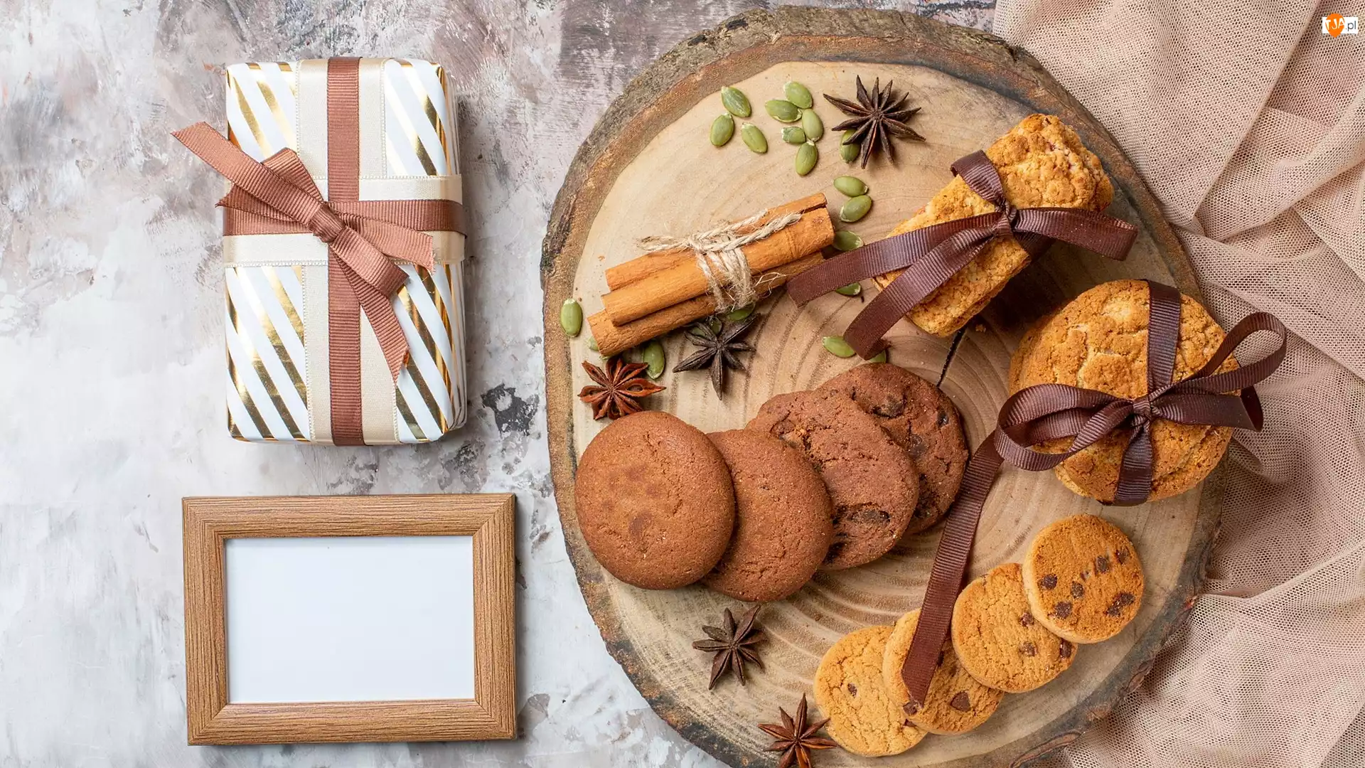 Ciasteczka ułożone na desce obok prezentu i ramk