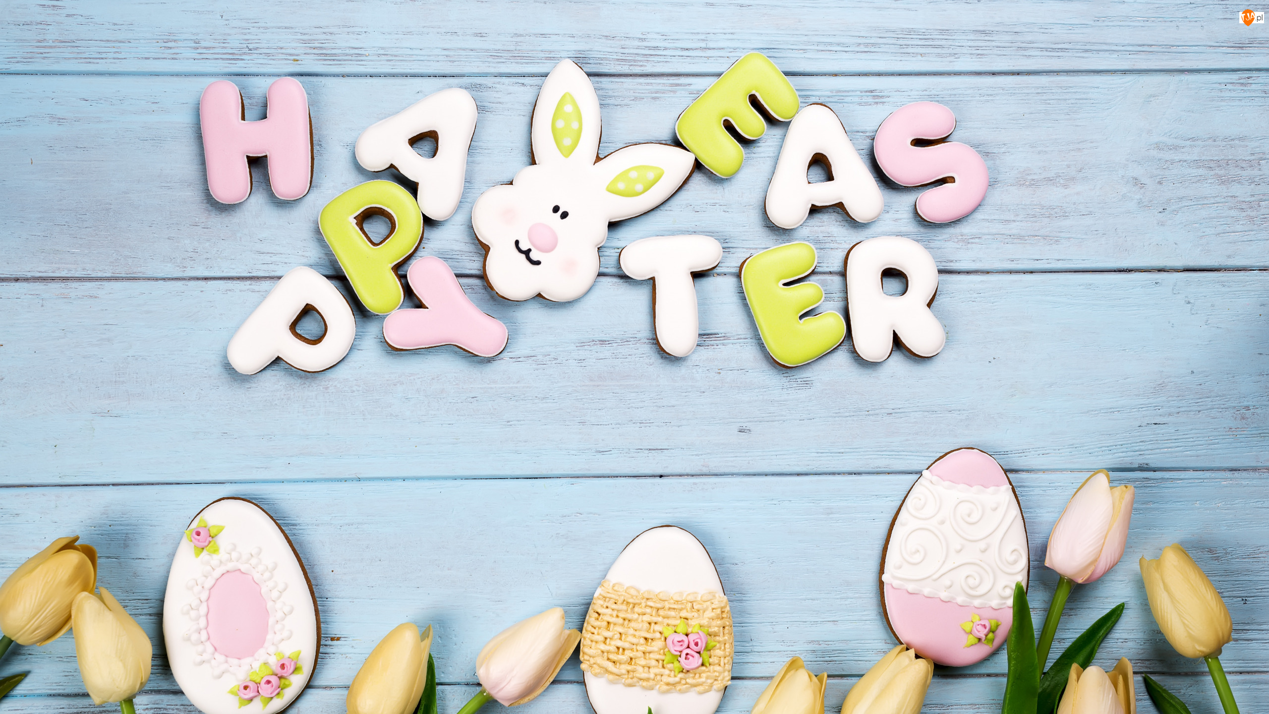 Pisanki, Zajączek, Wielkanoc, Ciastka, Happy Easter, Napis, Tulipany