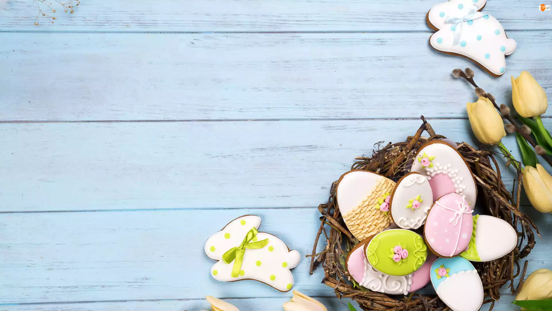 Ciasteczka, Pisanki, Gałązki, Wielkanoc, Wieniec, Zajączek, Tulipany