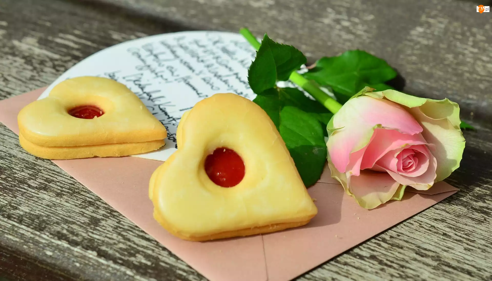 Ciasteczko róża i list miłosny na desce