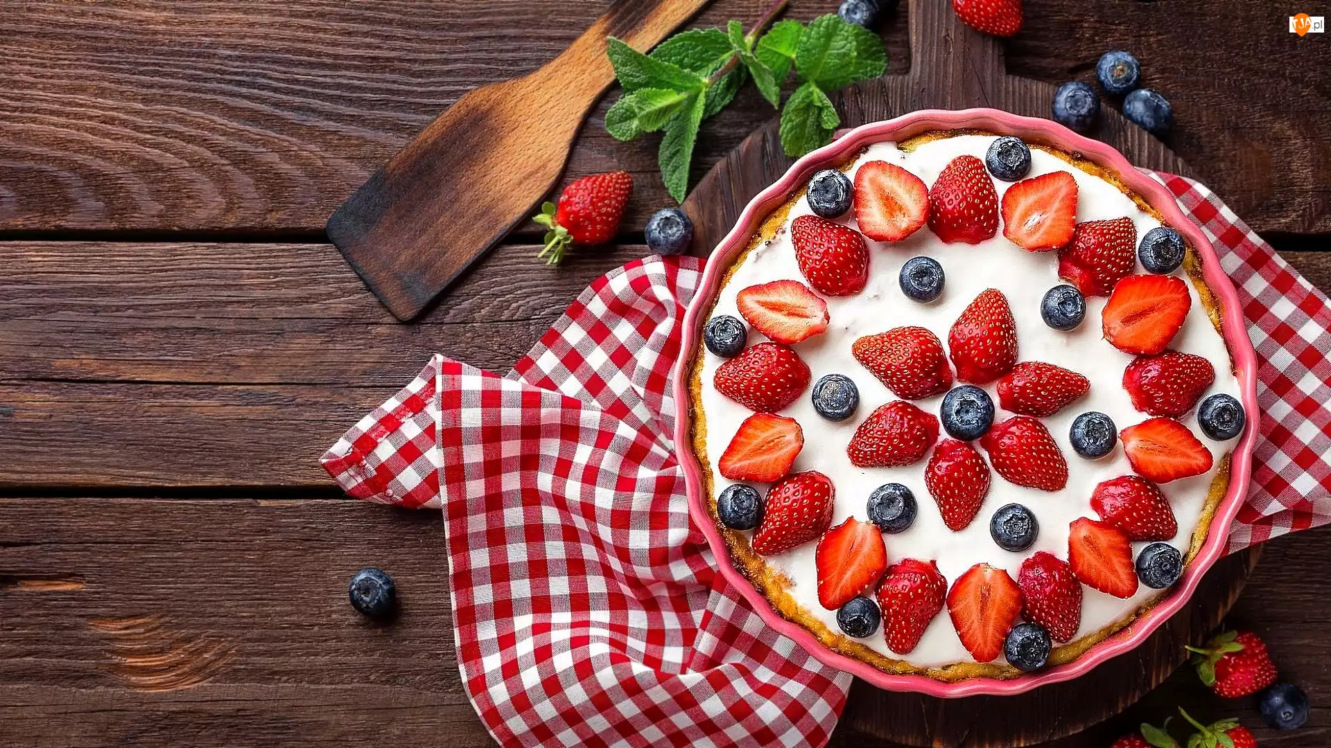 Drewniana, Ciasto, Talerz, Łopatka, Truskawki, Ścierka, Deski, Jagody