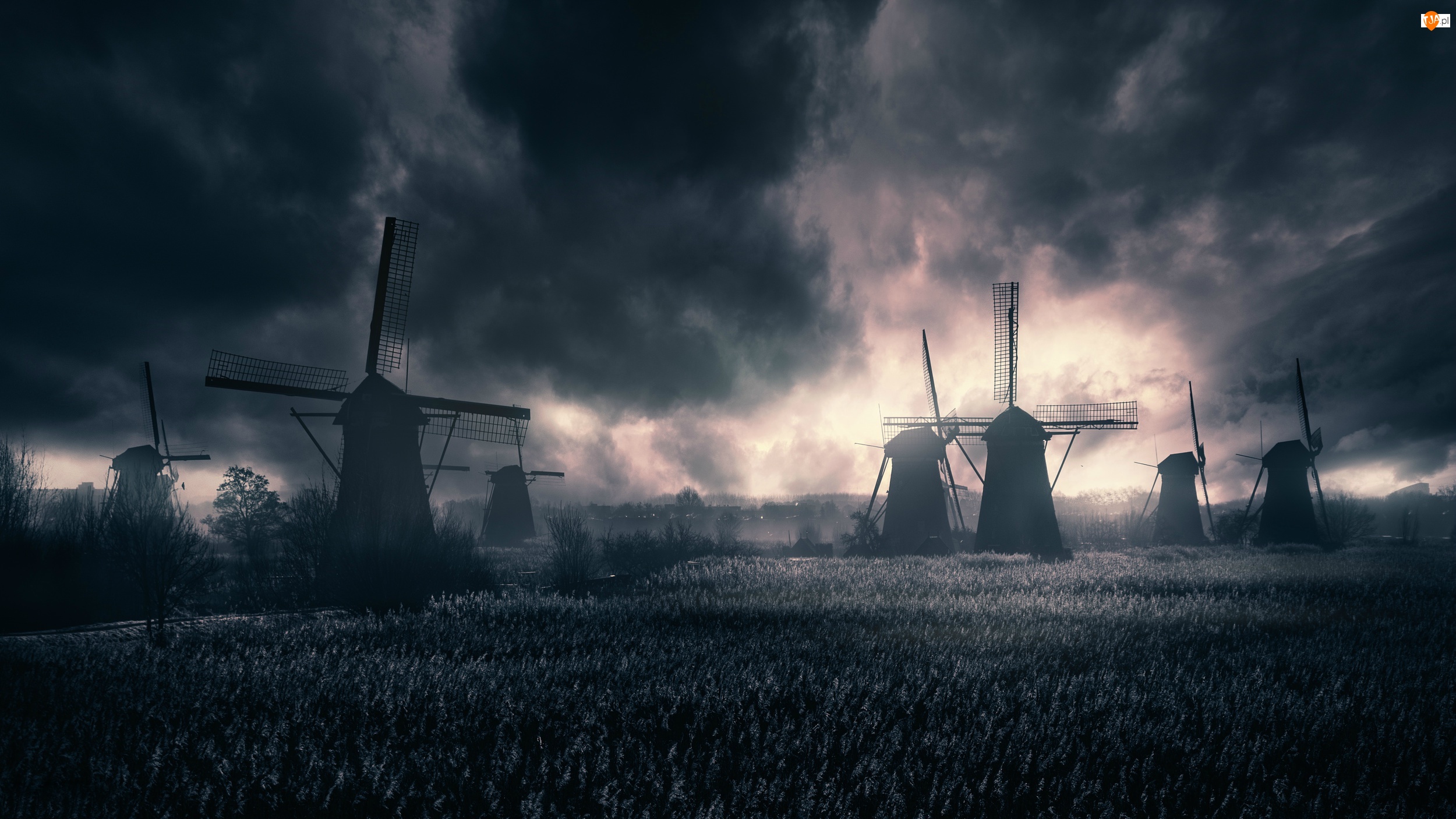 Ciemne, Wiatraki, Holandia, Pole, Wieś Kinderdijk, Chmury